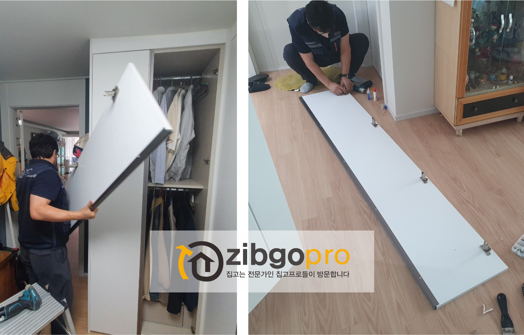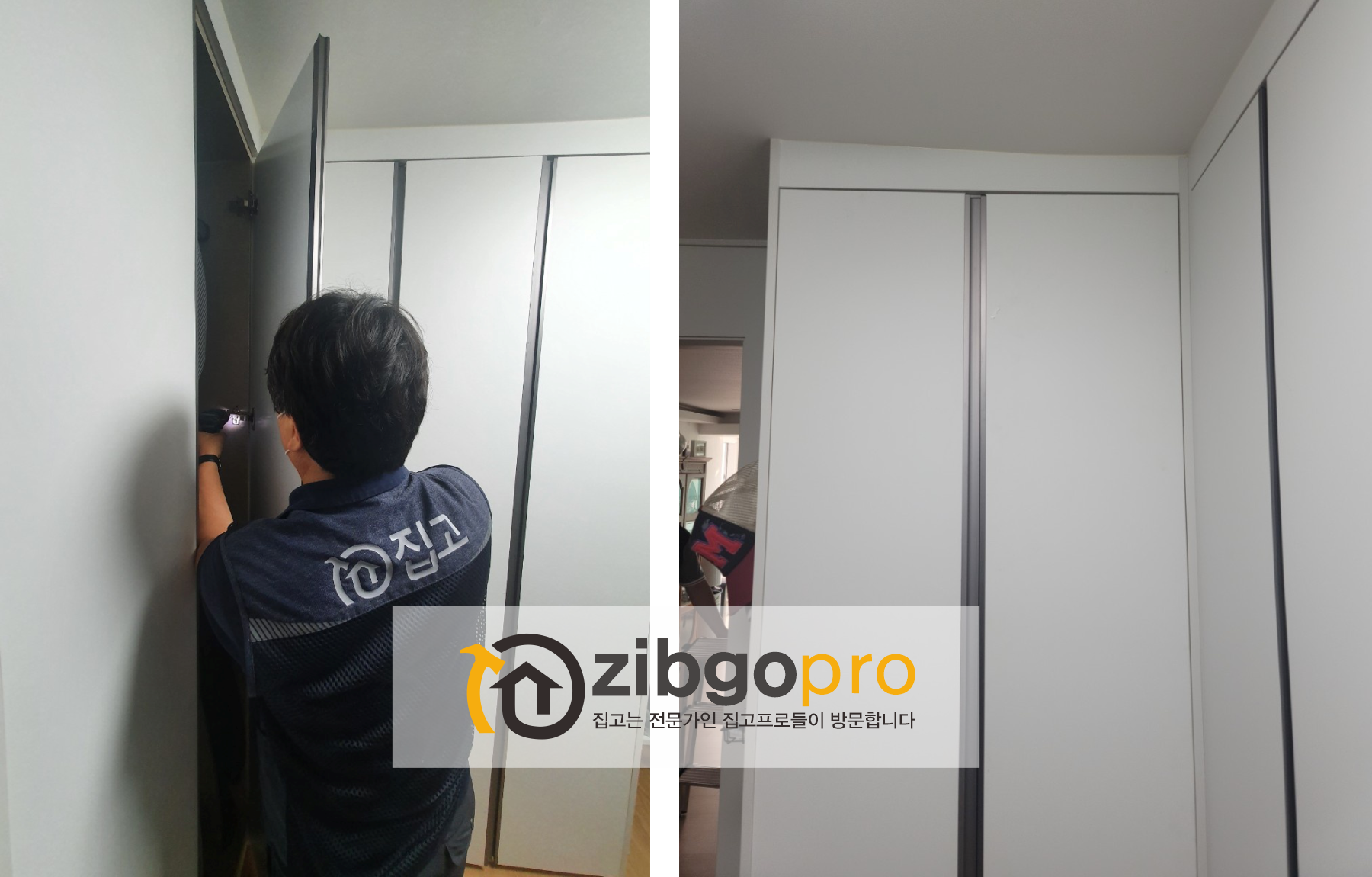인테리어를 하면서 설치된 붙박이장의 도어가 경첩이 이탈되어 고객님이 셀프로 수리하였는데 처짐발생으로 집고에서 출동하여 조치 하였습니다