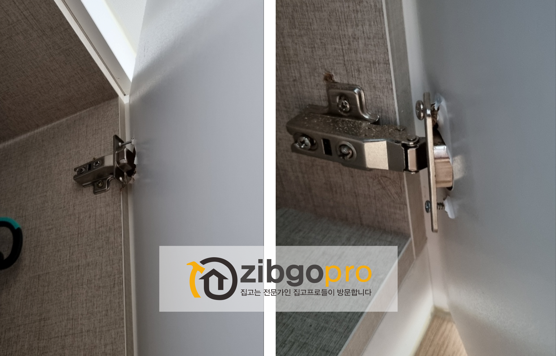 설치완료 사진 도어와 경첩을 조립한 후 가구몸통에 도어를 설치한후 도어의 수직과 수평 틈새를 조정하여 수리완료
